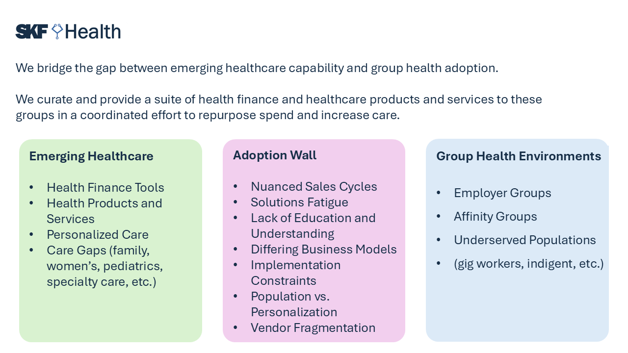 Our expertise extends across clinical services, health finance, and consumer health, allowing us to offer a unique, holistic approach to healthcare innovation. With SKF Health, you’re not just preparing for the future — you’re shaping it.